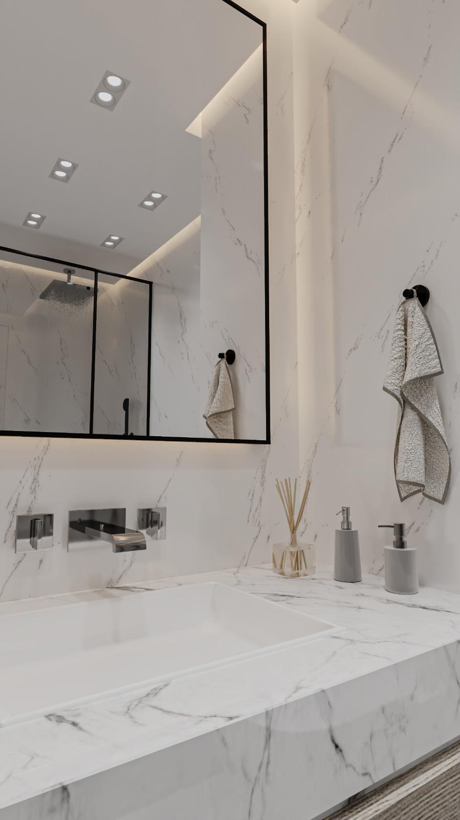 Apartments come in a fine finish, featuring an American kitchen, built-in kitchen equipment, laminate flooring in the bedrooms, tiled flooring in the living room, steel entrance doors with top-level security, stretch ceilings with spot lighting, washable paint on the walls, fully equipped bathrooms, double-glazed windows, air conditioning in the living room, video intercom, apartment-to-elevator call system, and a fire alarm system.