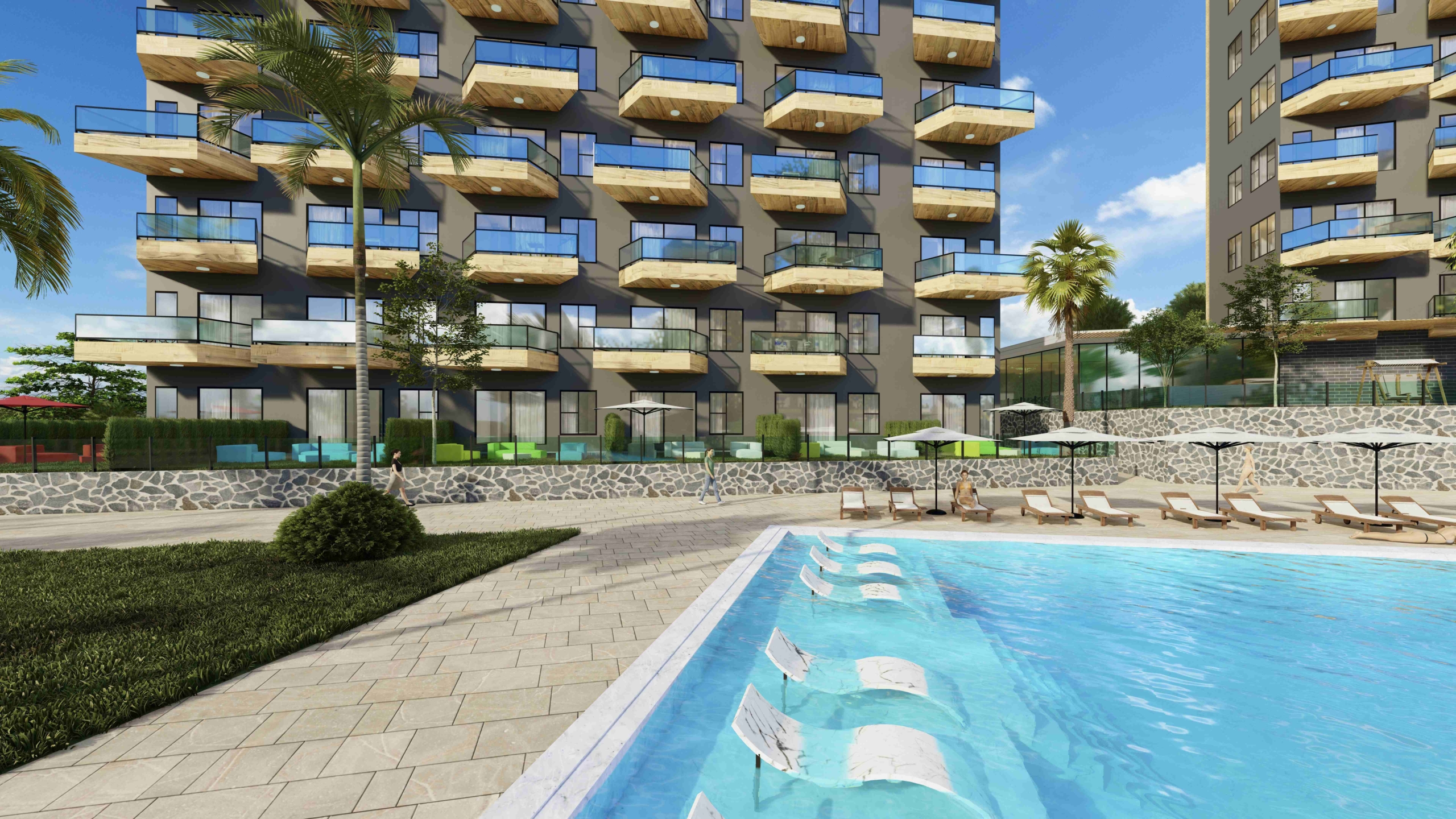Enjoy a wide range of on-site facilities, including a large outdoor pool, pool with slides, BBQ area, children’s playground, fitness center, indoor winter pool, hamam, Roman steam room, Finnish sauna, children’s playroom, tennis court, and relaxation areas by the pool. The complex also features an antibacterial facade, noise and moisture insulation according to European standards, modern elevator, fire alarm system, central satellite system, security, and video surveillance.