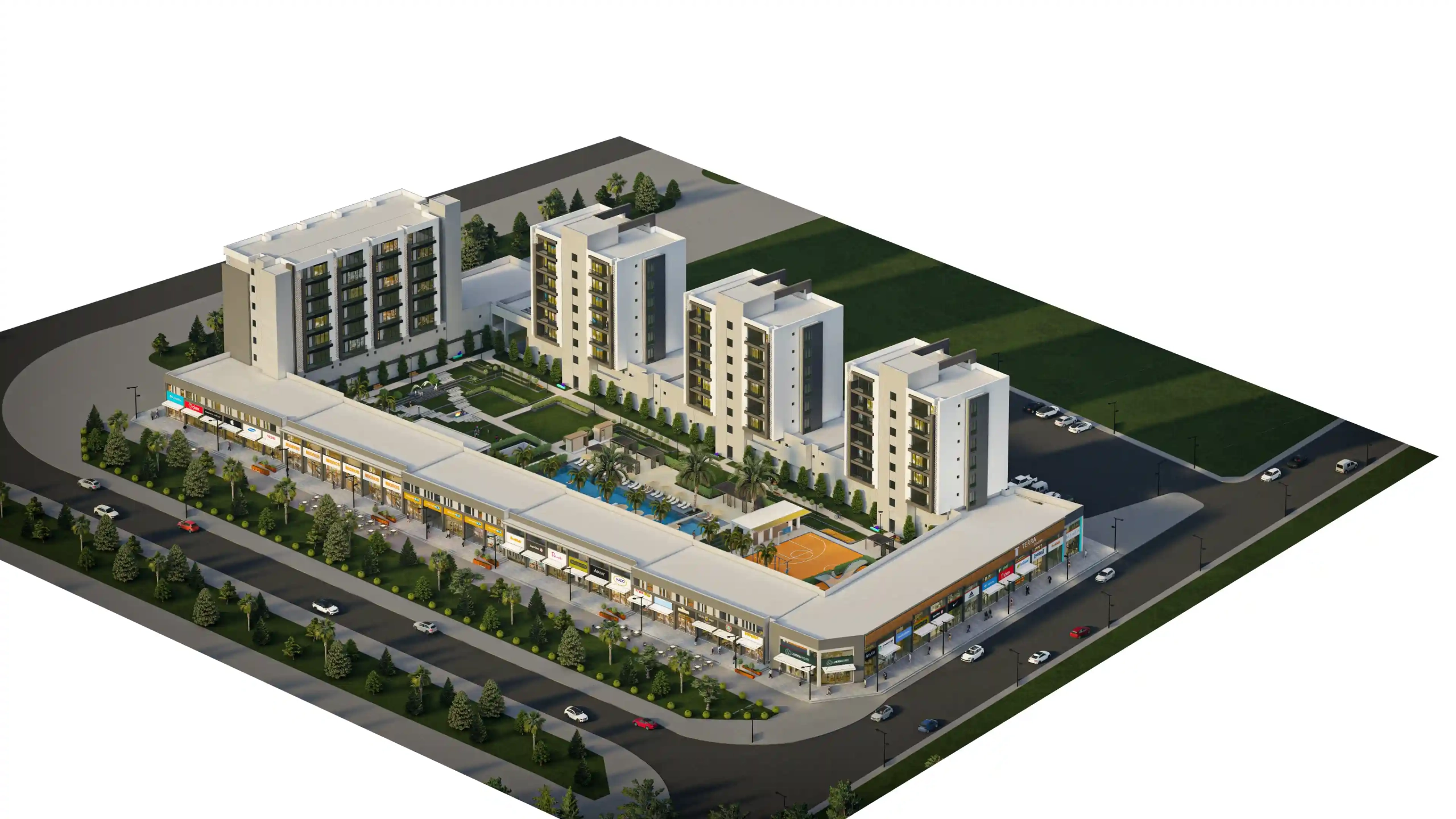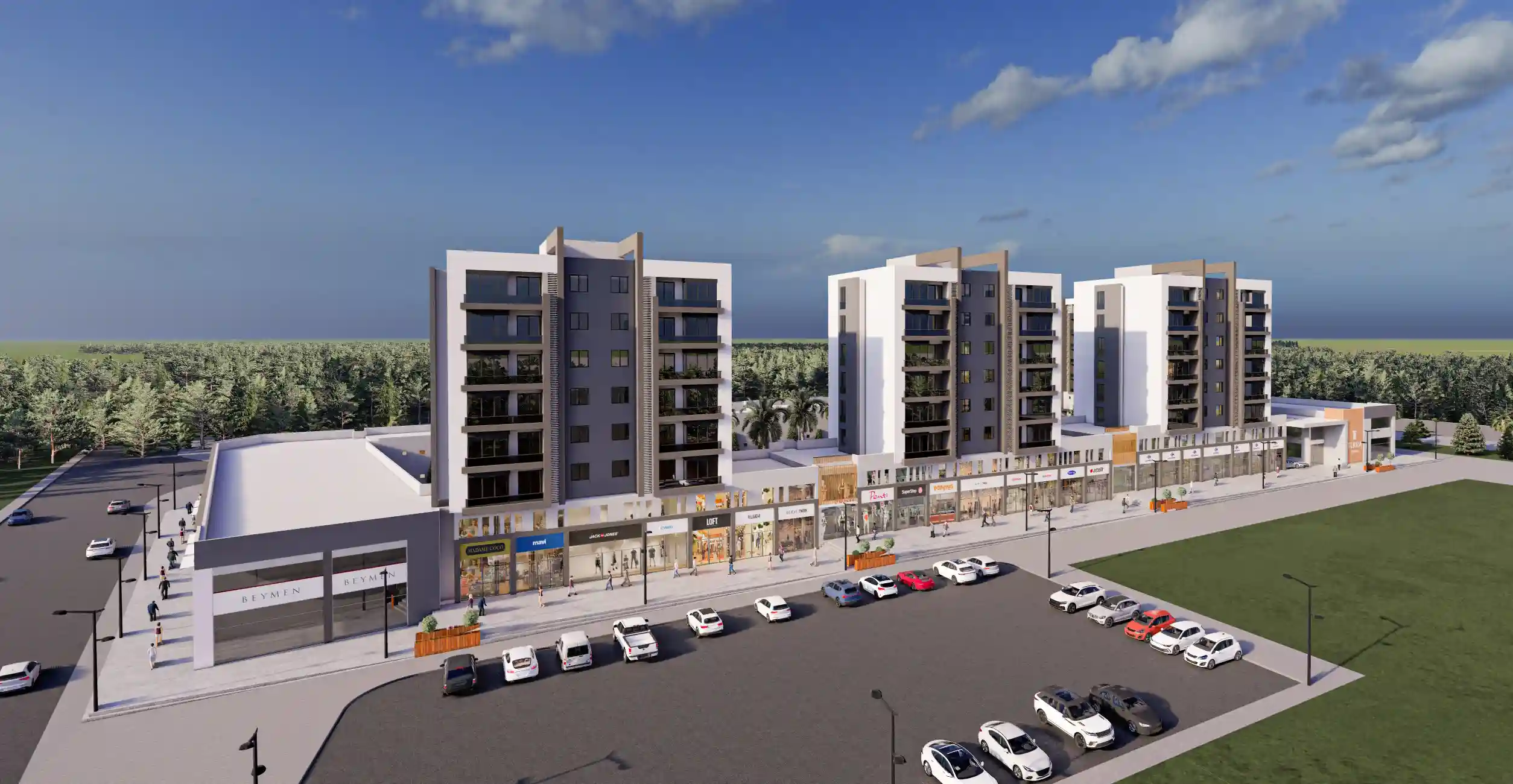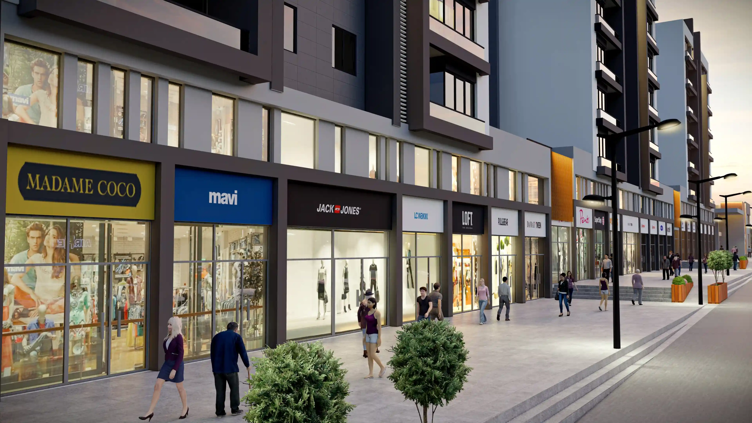 Our project highlights its commercial spaces with 81 shop units designed in a street-shop concept. These commercial spaces are complemented by 4 blocks of residential units.