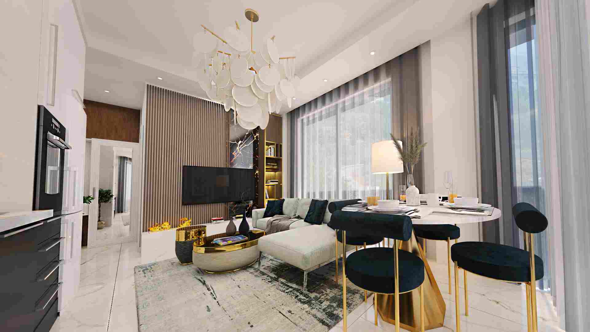 Inside the apartments, you will find modern steel security doors, ready-made kitchens, built-in bathrooms, high-quality certified fixtures, tempered glass shower curtains, high-quality ceramic tiles, and UPVC double-glazed windows and doors.