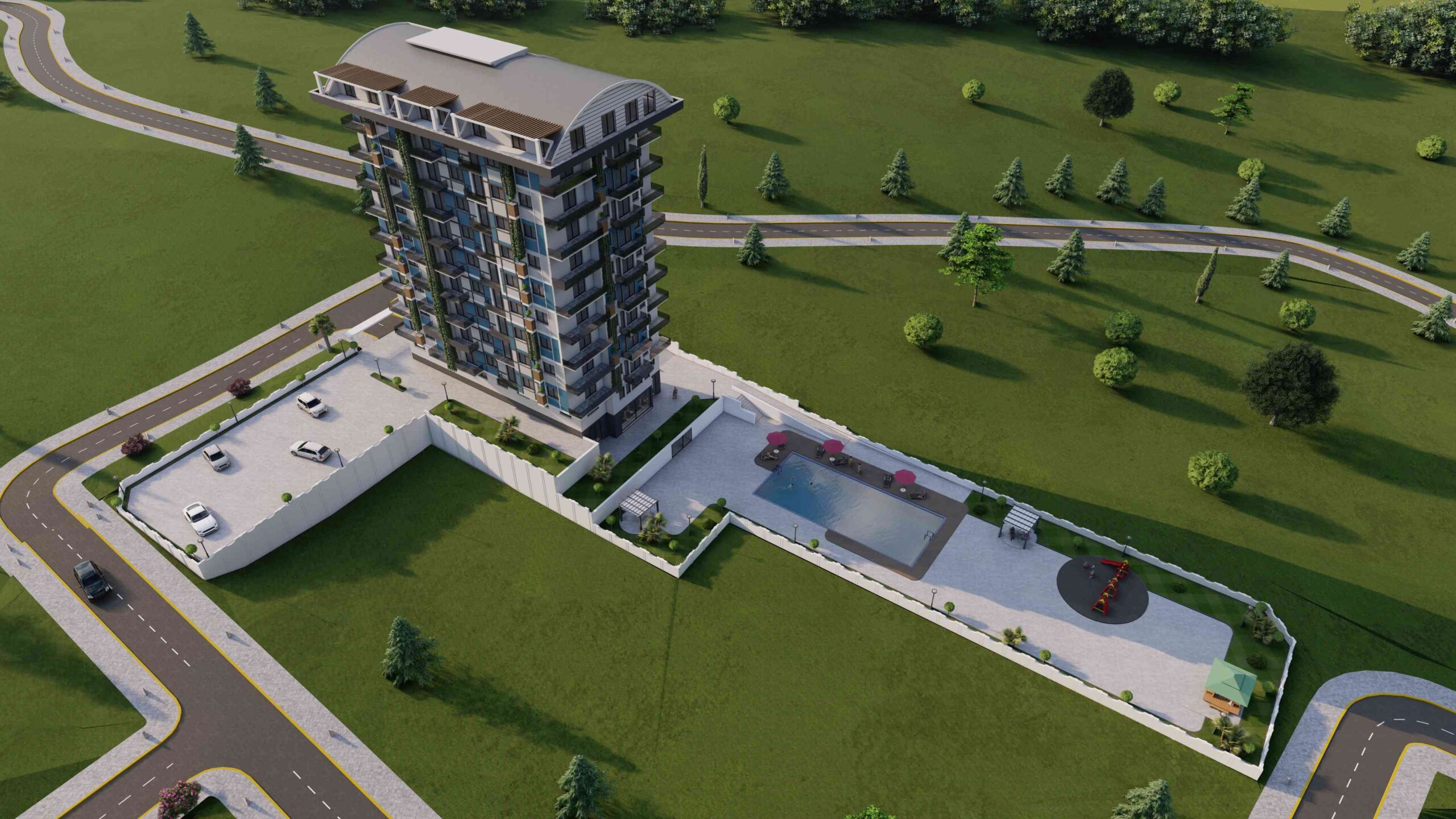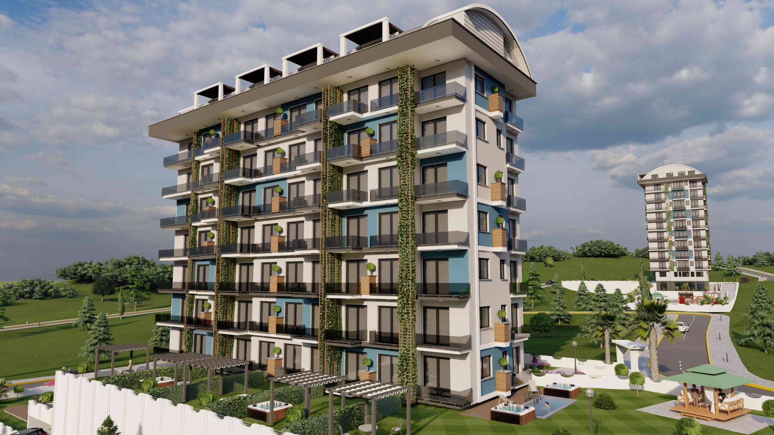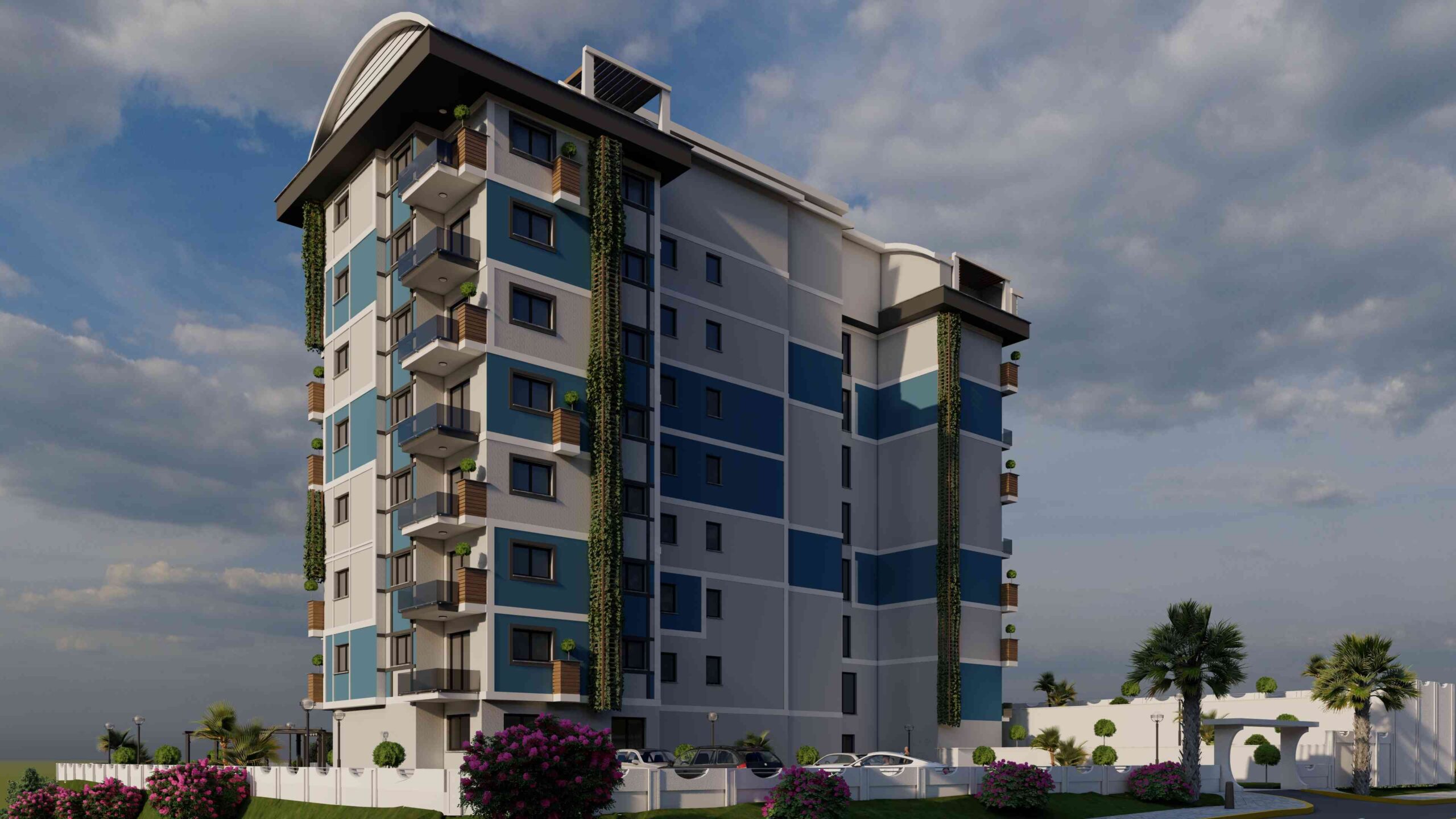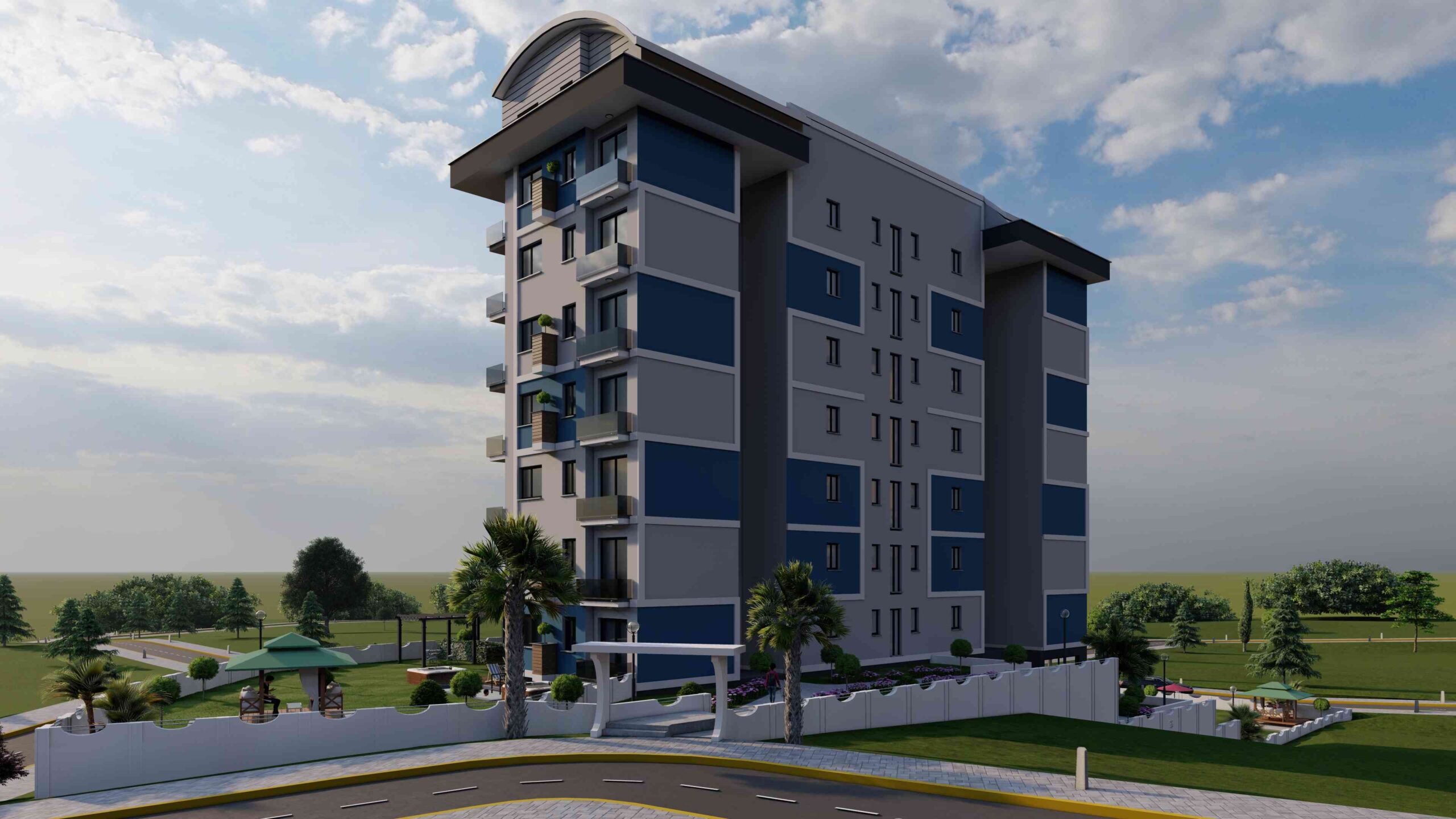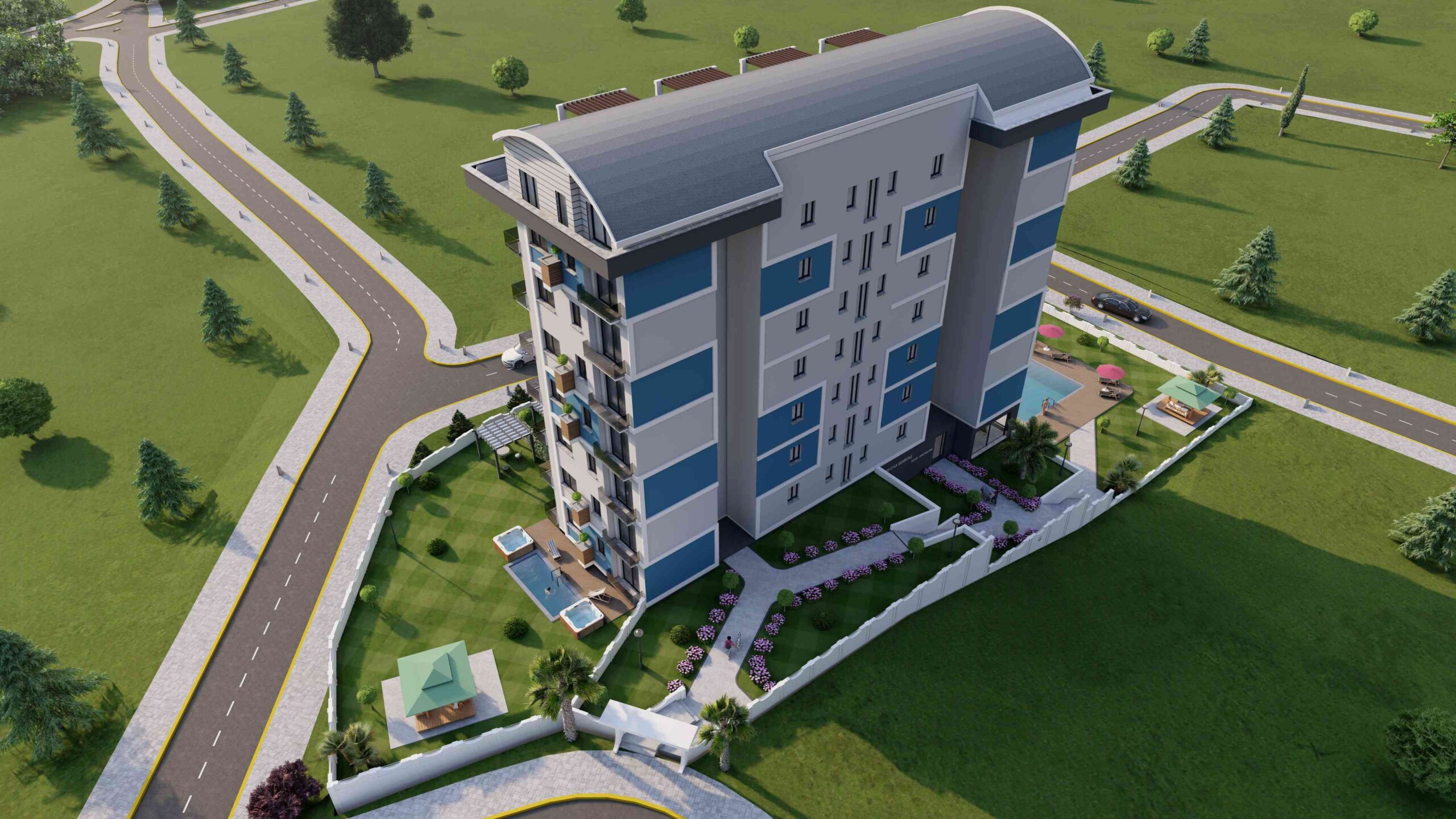 Built on a 3,120 m2 tapu area with a basement, ground floor, 8 + roof, our complex offers the perfect balance of luxury and comfort. The facade is situated in the south, west, east, and north direction. The distance to the sea is only 2 km.