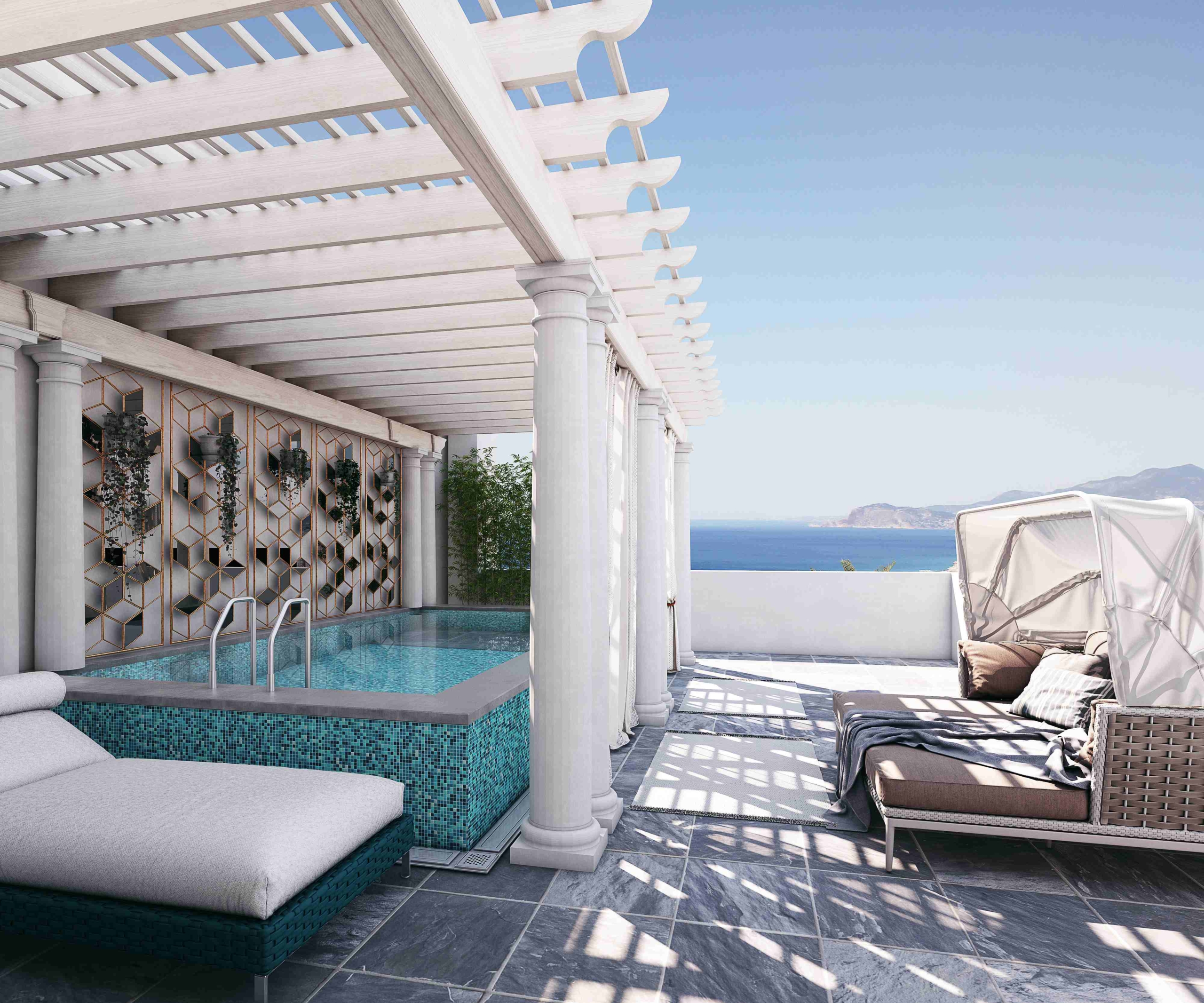 The apartments will be equipped with air conditioning system, underfloor heating and household appliances. The penthouses will be equipped with saunas and indoor pools on terraces.