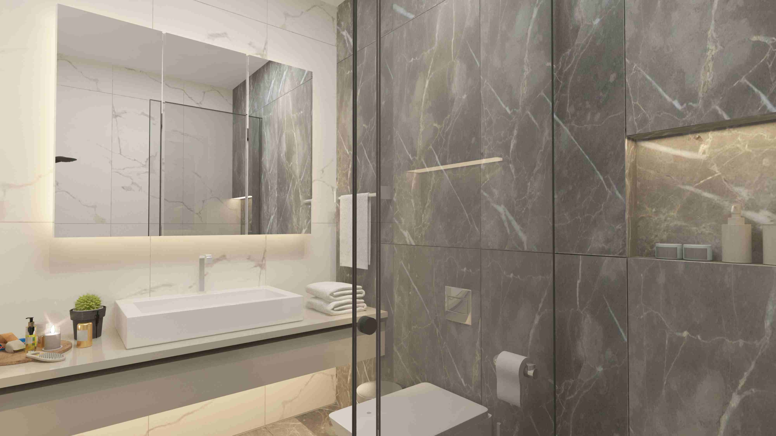 3 bedroom penthouses are 160 m2 and include a living room, an open-plan kitchen, 2 bathrooms, an en-suite bathroom, a storage room, and 2 terraces
