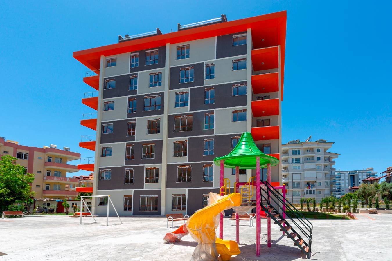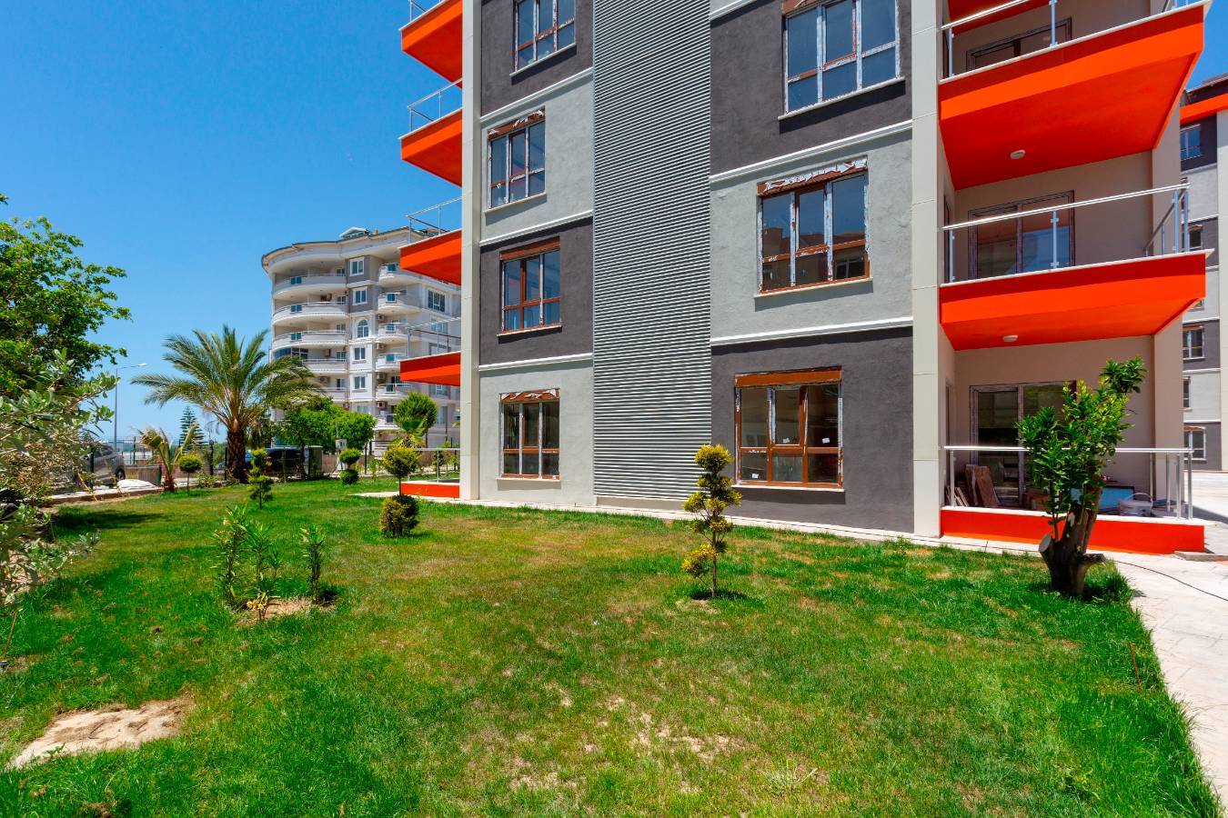 Daire, 7 katlı bir binanın 4. katında yer almakta olup geniş balkonundan deniz manzaralıdır. Modern bir tasarıma ve 77 m2'lik bir alana sahip daire, tamamen mobilyalı 2 yatak odası ve 1 oturma odasından oluşmaktadır. Güney ve batı cepheleri gün boyunca bol miktarda gün ışığı ve temiz hava sağlar.