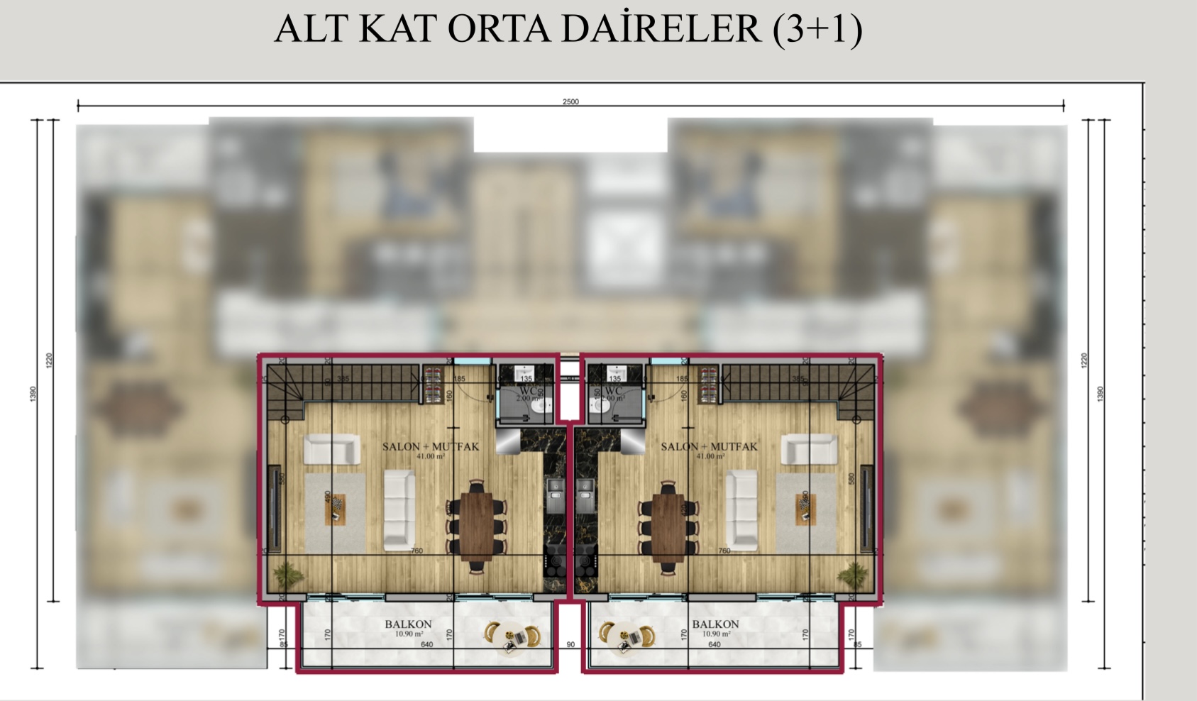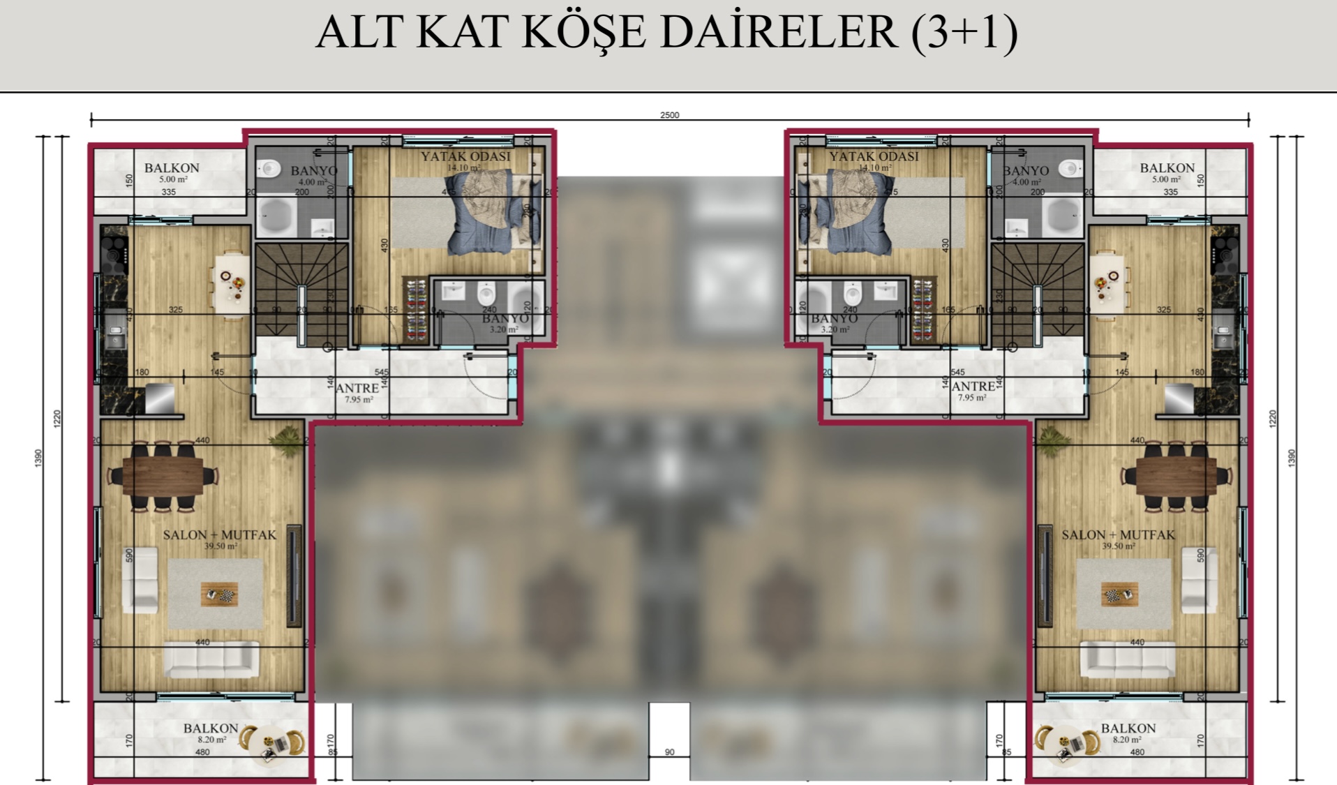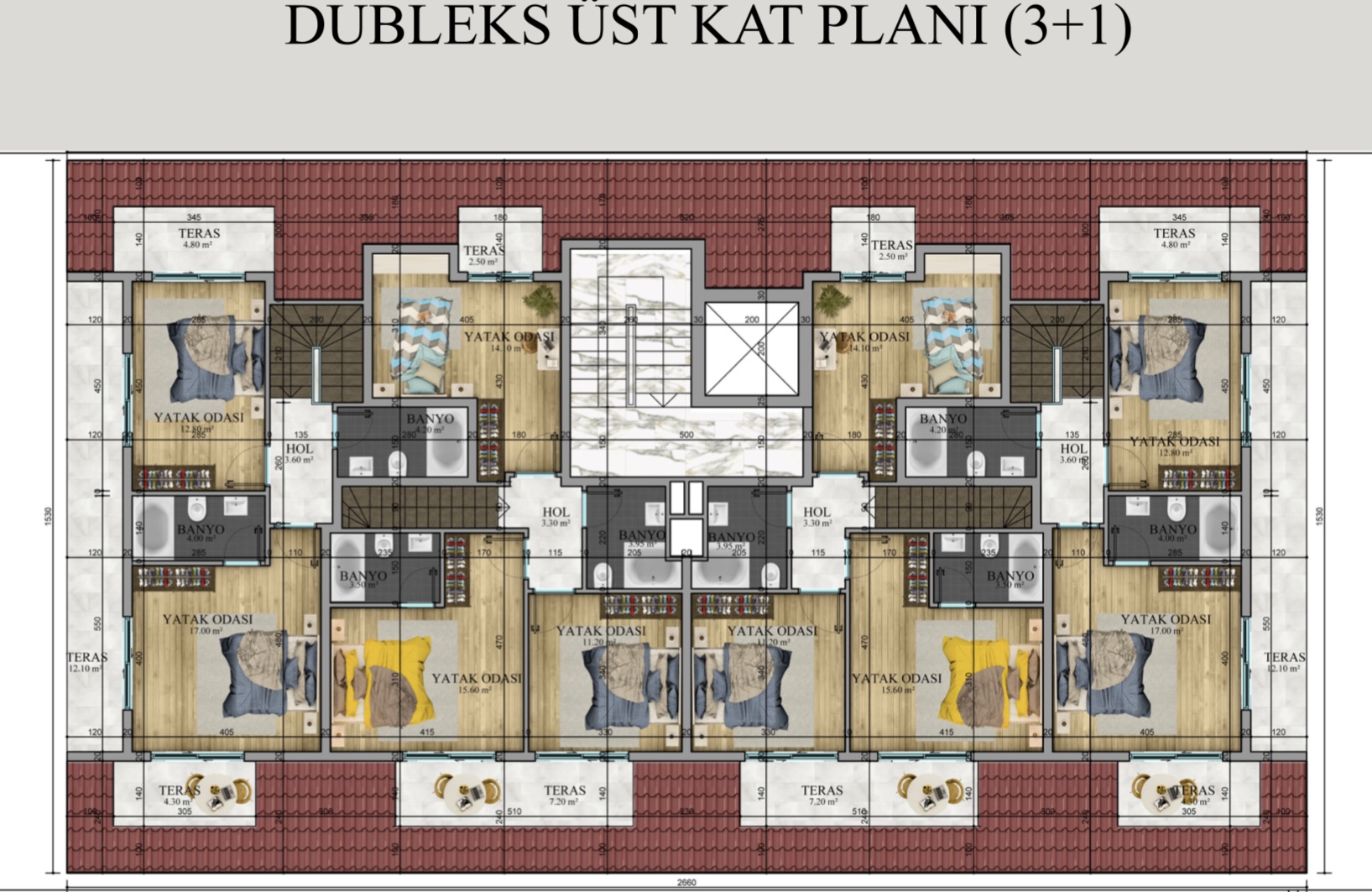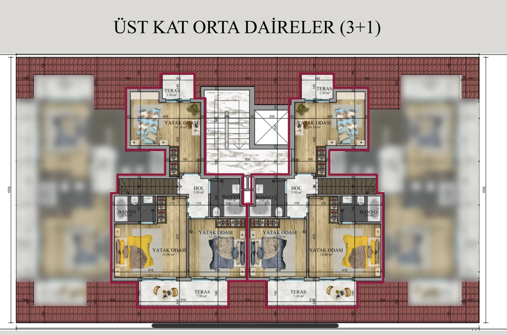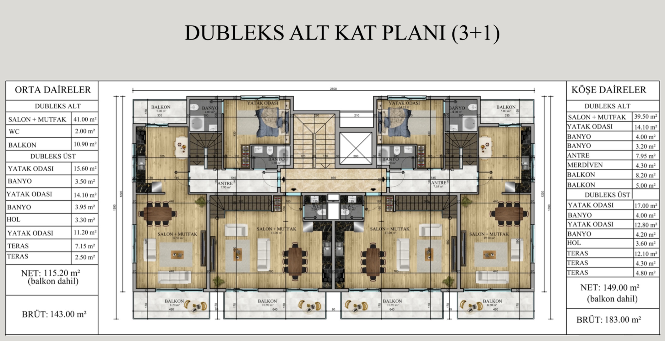 Projemizde 1.045 metrekare arsa üzerinde 1 blokta toplam 4 adet 3+1 ve 4 adet premium 3+1 dubleks konut bulunmaktadır.