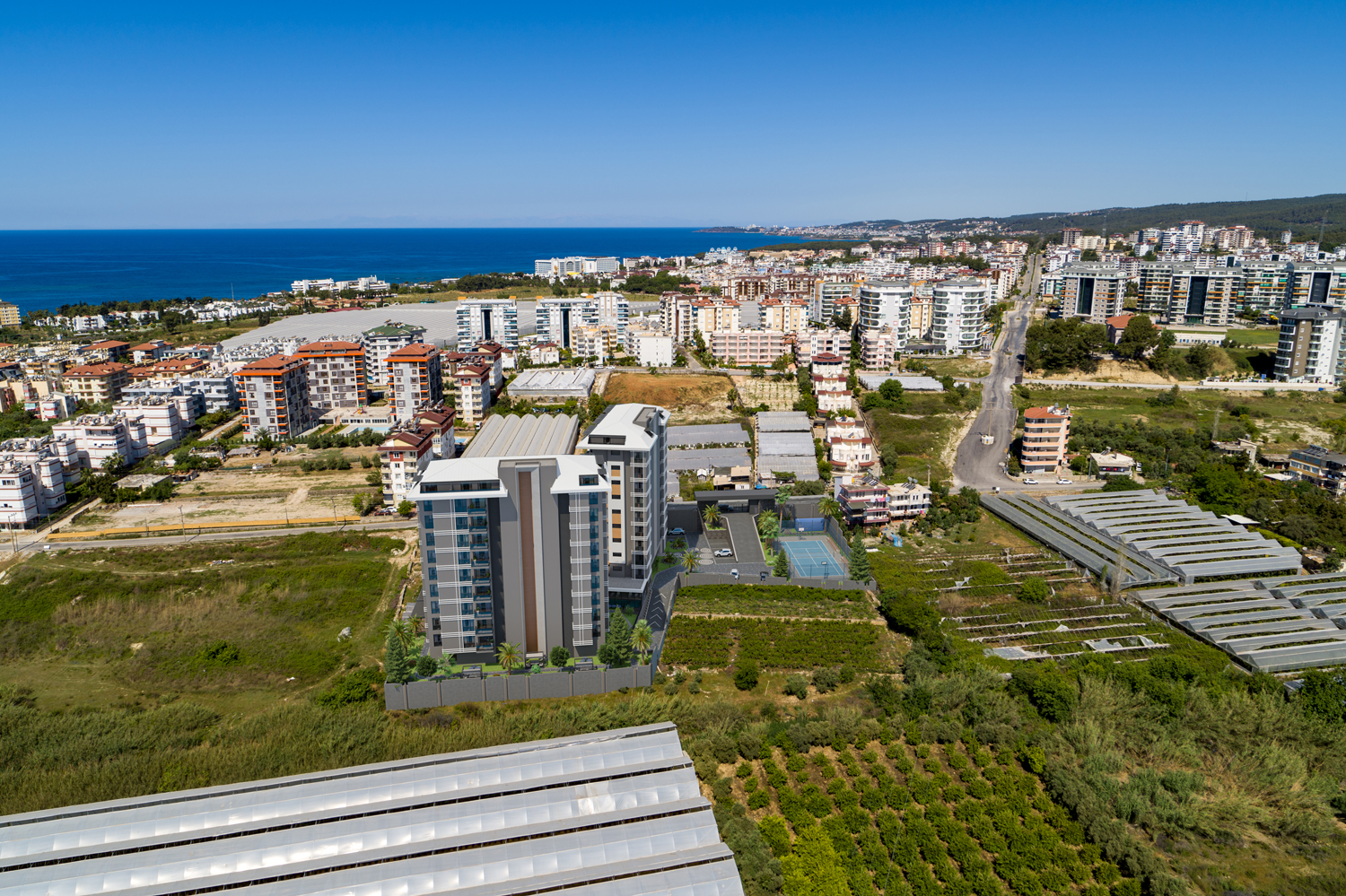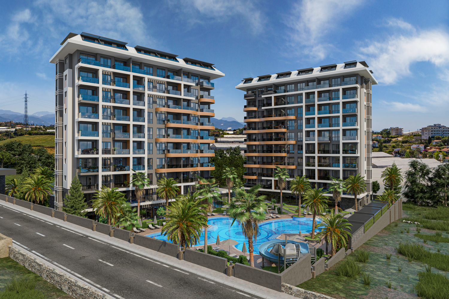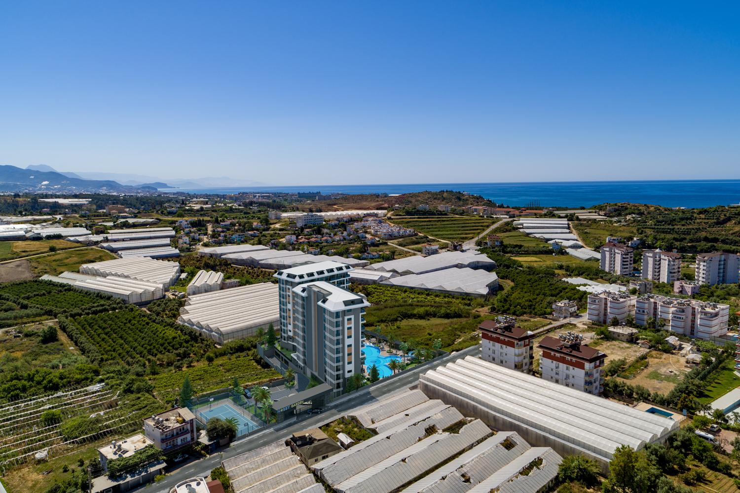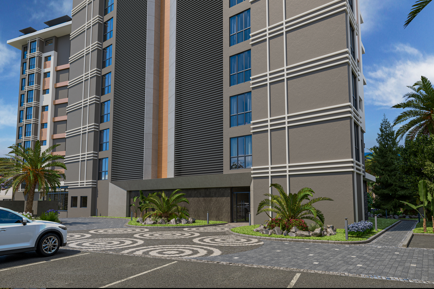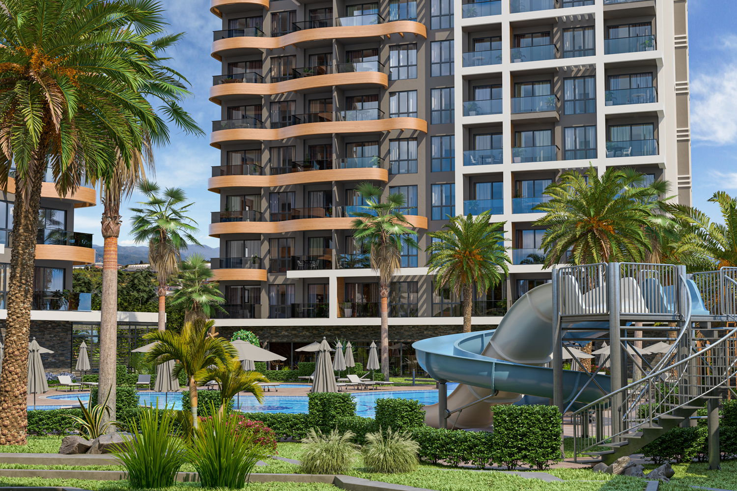 Konut, Alanya'nın önde gelen bir mimarlık firması tarafından tasarlanan modern tasarımıyla çeşitli düzenlerde 117 daire barındıran iki bloktan oluşmaktadır.