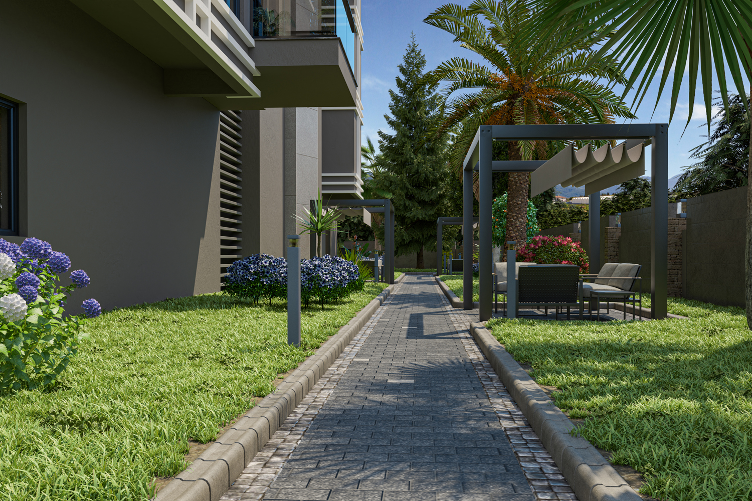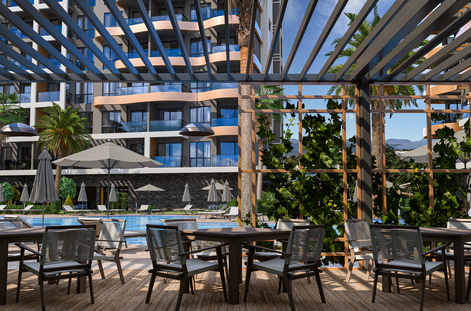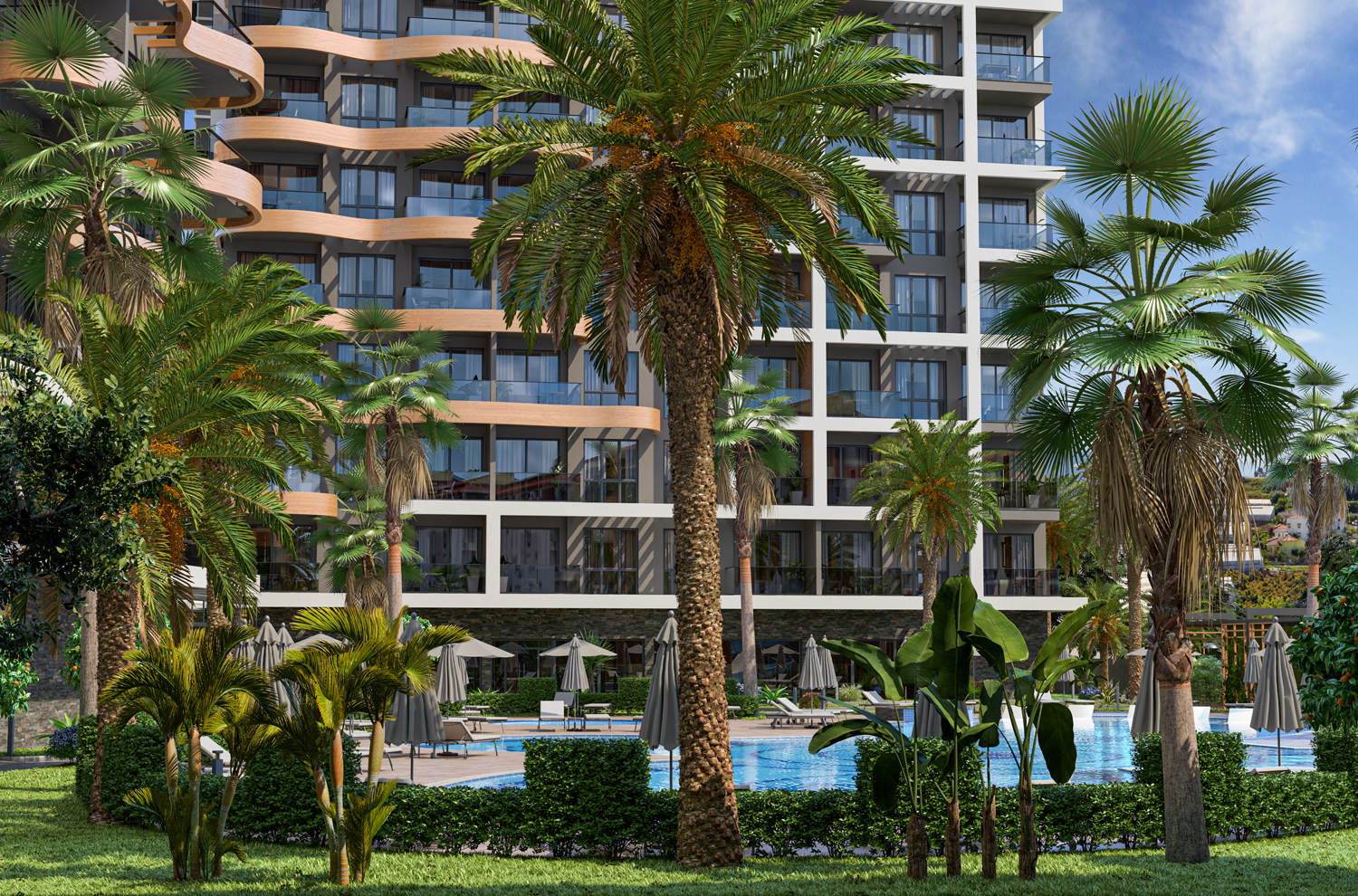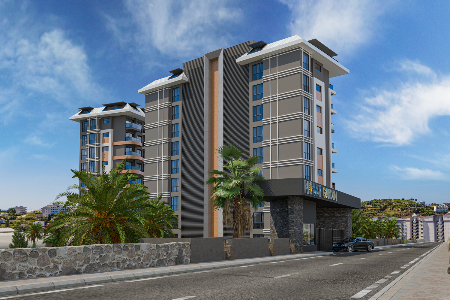 Konut, Alanya'nın önde gelen bir mimarlık firması tarafından tasarlanan modern tasarımıyla çeşitli düzenlerde 117 daire barındıran iki bloktan oluşmaktadır.